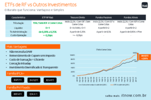 A principal característica de um ETF de Renda Fixa é que ele é composto por uma seleção de títulos IPCA+ ou prefixados, facilitando o seu investimento que já vai ser naturalmente diversificado. Além disso, essas estratégias são reconhecidas por terem um custo baixo, facilidade de serem investidas e a transparência, pois o investidor consegue ver exatamente os ativos que está comprando pelo site do It Now.