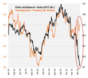 Um sinal preocupante sobre a perda de atratividade do dólar é que as taxas de juros sobre títulos americanos longos subiram, ao mesmo tempo que o dólar desvalorizou (gráfico abaixo) e a bolsa caiu. Esta reação é típica de economias emergentes, em que instabilidades econômicas geram fuga de todos os ativos do país.